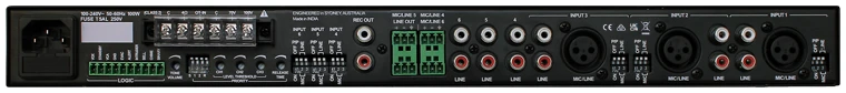 The mixer amplifier includes 7 external and 2 internal audio input channels, each channel offering individual channel volume control, equalizer and gain control. An inbuilt user customizable tone generator, MP3 player, Bluetooth® module, 3.5mm jack and USB charger are included as standard.