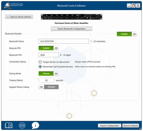 - Programmable Bluetooth name, PIN and security features via Bluetooth PC Control Software