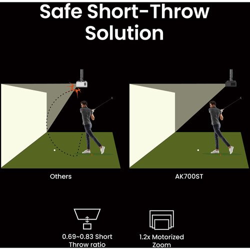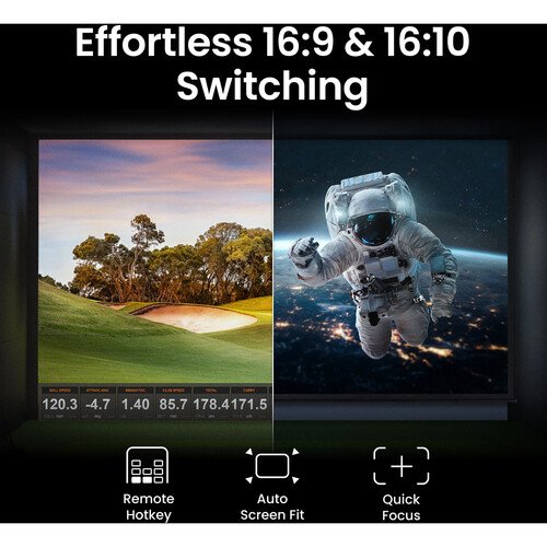 Switch easily from immersive golf sim to 4K home cinema with the BenQ AK700ST 4000-Lumen XPR UHD 4K Short-Throw Laser DLP Golf Simulator Projector. Featuring an Auto Screen Fit function with support for 16:9, 16:10, 4:3, and 1:1 screen ratios, the AK700ST provides a quick and simple setup with flexible installation options.