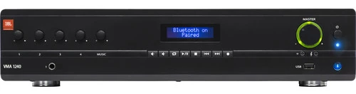 The JBL VMA1240 is a Commercial Series Bluetooth-enabled mixer/amplifier designed to provide flexible multi-source mixing and amplification for installation in restaurants, educational institutions, fitness centers, and retail stores. It features a 5-in/1-out mixer and 240W of output power. It can be installed in a standard 19” equipment rack with the supplied rackmount kit or set on a surface such as a desk or ledge.