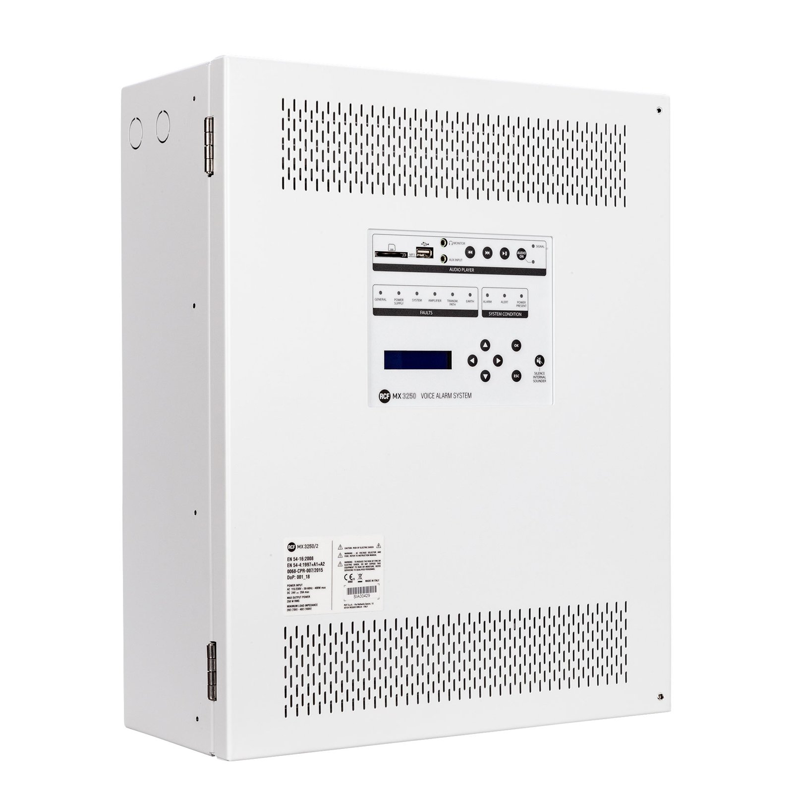 The MX 3250/4 is the core of the DXT 3000 Voice Alarm system, tailored for small and medium-sized installations that require EN 54-16 compliance. This unit delivers up to 250 W of total power through its efficient and reliable Class D+ amplifier and supports 4 independently managed zones. It includes a spare amplifier facility and features integrated emergency message playback via a monitored SD card. The onboard DSP ensures optimized sound performance, enhancing voice clarity and background music quality. With EN 54-4 certified power supply and the ability to house backup batteries internally, it offers a compact and complete solution. The system is expandable with microphone consoles like BM 3804, BM 3804FM, and ME 3801, and extension panels such as BE 3806 for live paging. It supports both wall and rack mounting options for versatile installation.