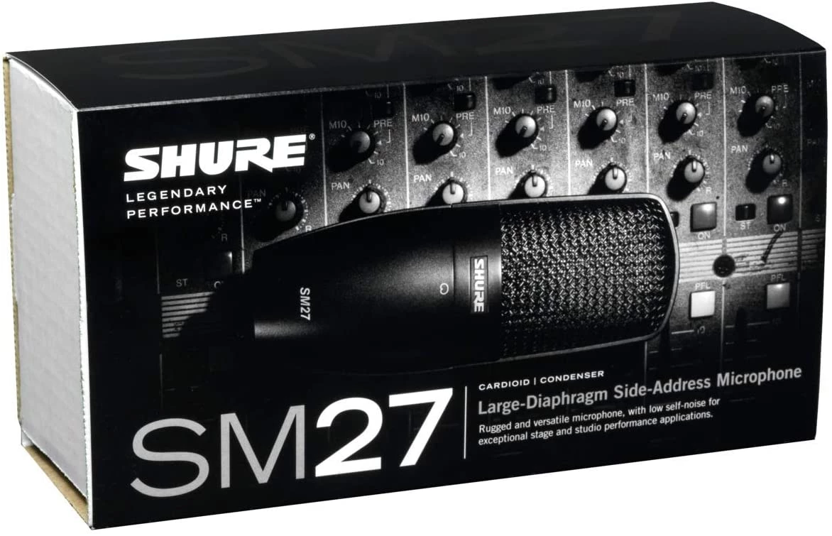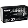 Cardioid Side-Address Condenser Microphone, includes zipper pouch and stand adapter. The SM27 is a rugged and versatile large-diaphragm, side-address cardioid microphone, with low self-noise and extended frequency response that picks up vocal and instrument nuances with clarity. Durable Shure construction features three separate mesh layers that reduce wind and breath noise. Equally comfortable on stage or in the studio.