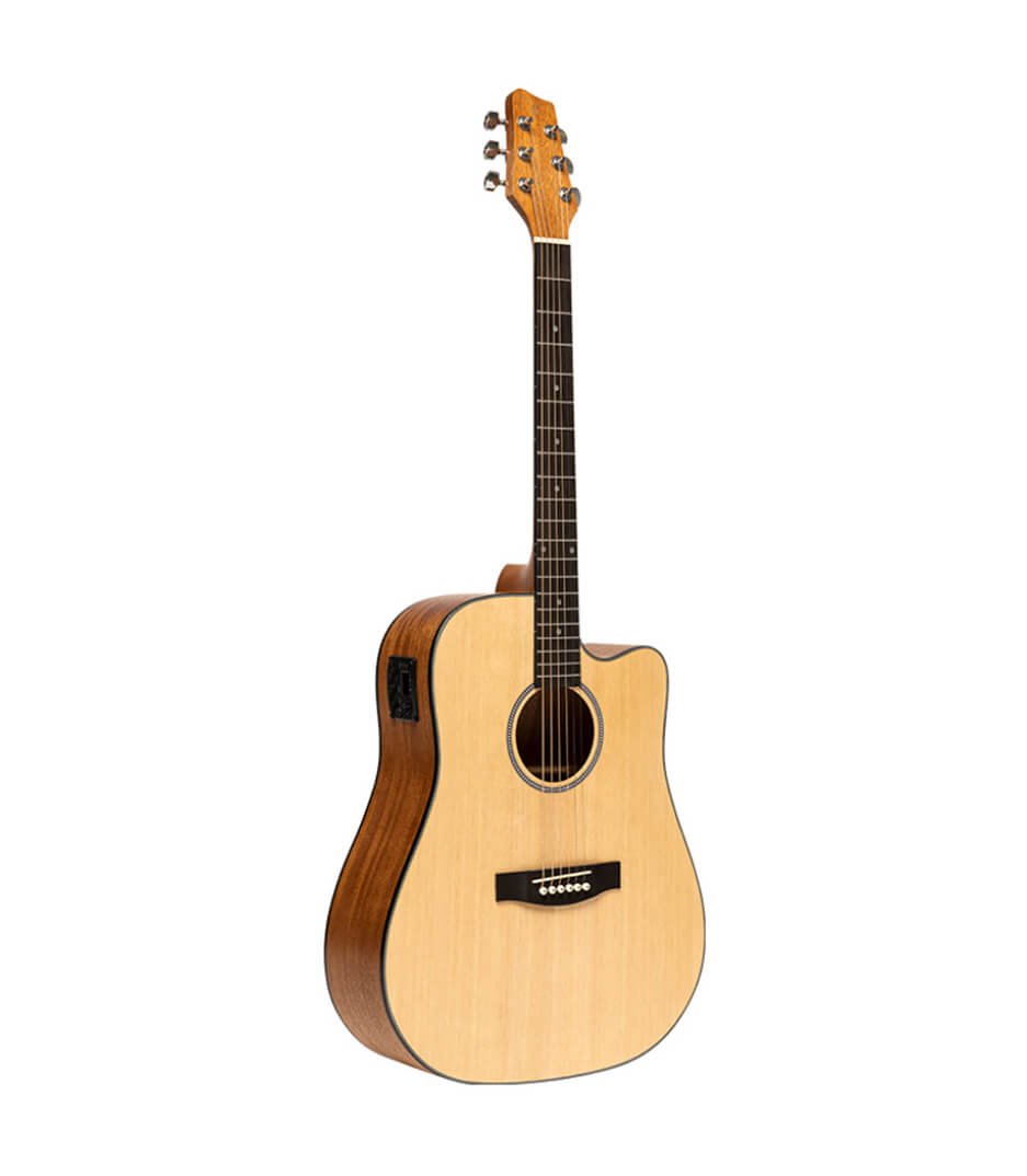 The Stagg SA25 DCE Spruce Electro-Acoustic Guitar in Natural Finish combines warm acoustic tone with the versatility of built-in electronics. Designed for performance and recording, it offers a spruce top with cutaway design for easy upper fret access and balanced sound projection.