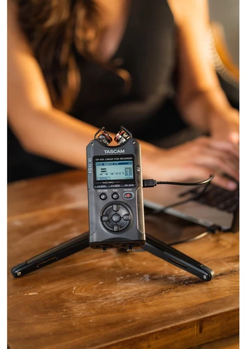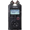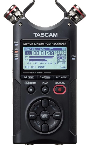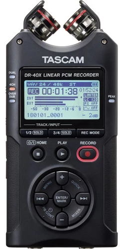 For podcasts, sound effects, and music recording applications, the Tascam DR-40X portable handheld recorder is capable of capturing up to four tracks of high-resolution audio with no external microphones required. Its onboard unidirectional condenser mics can be set for a wide or tight stereo image, and may be used simultaneously with the mic/line combo inputs. Equally adept as a handheld device or when used in stand- or camera-mounted setups, the DR-40X can handle anything from sampling sessions and interviews to podcasts and live concerts.